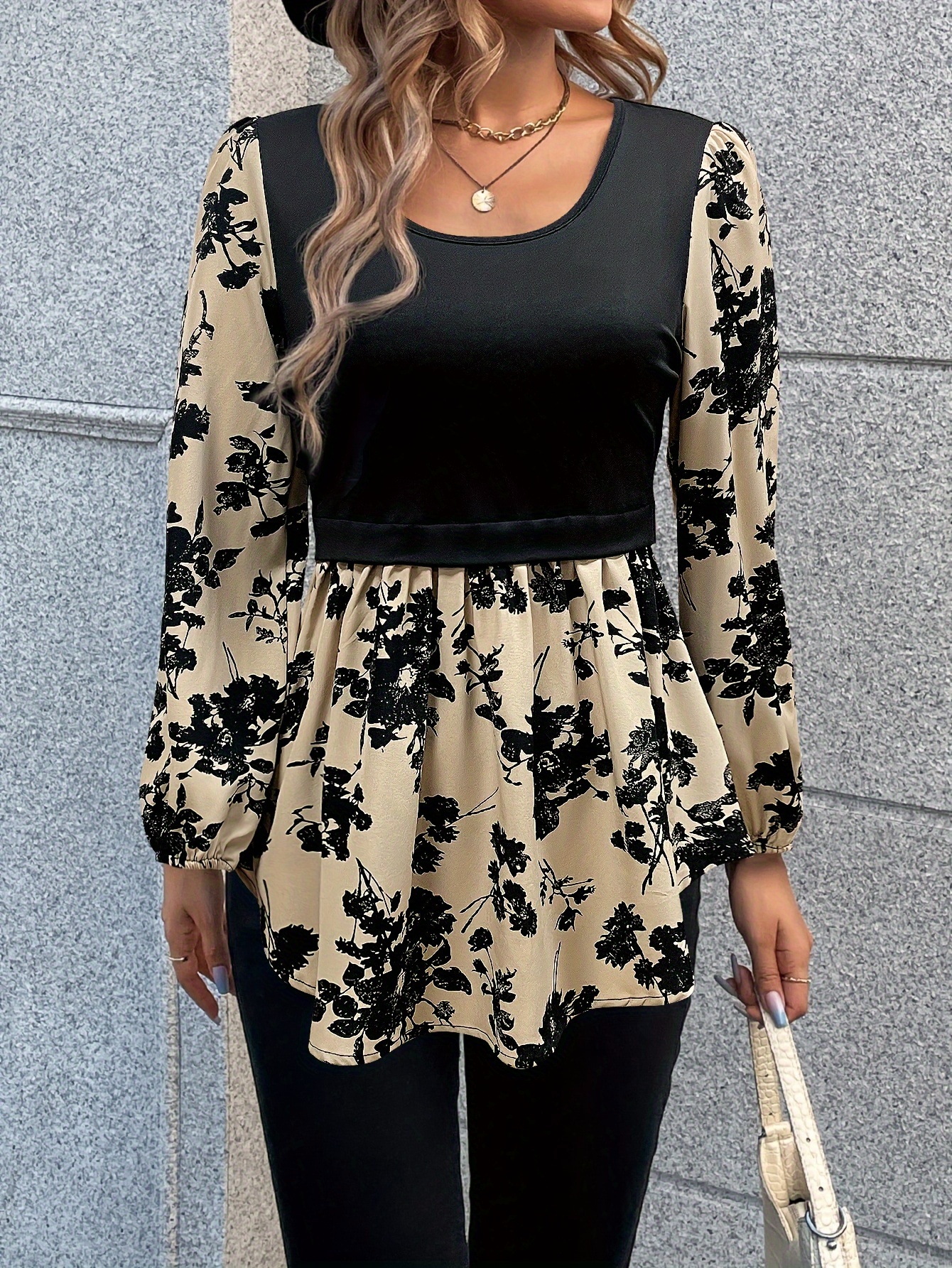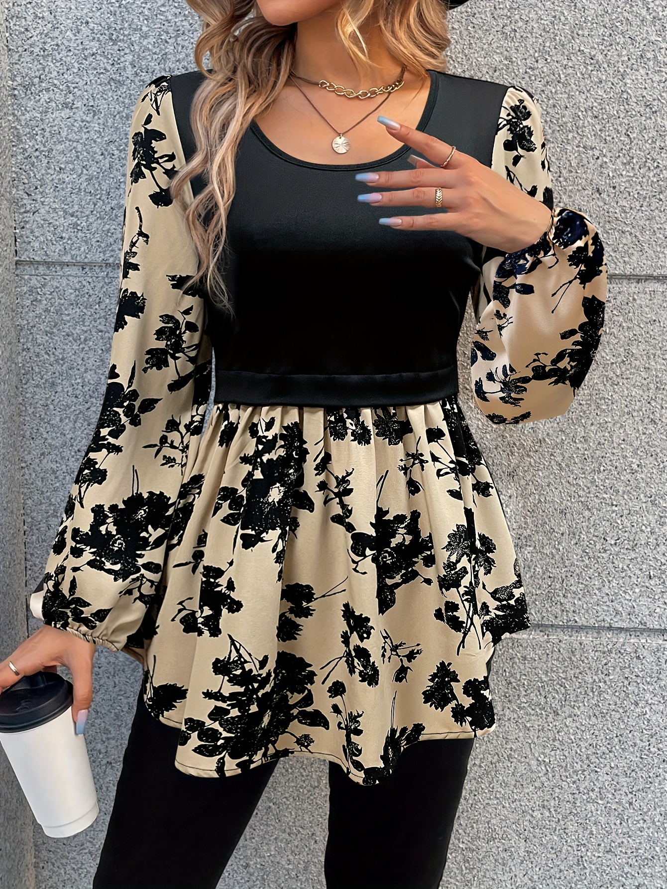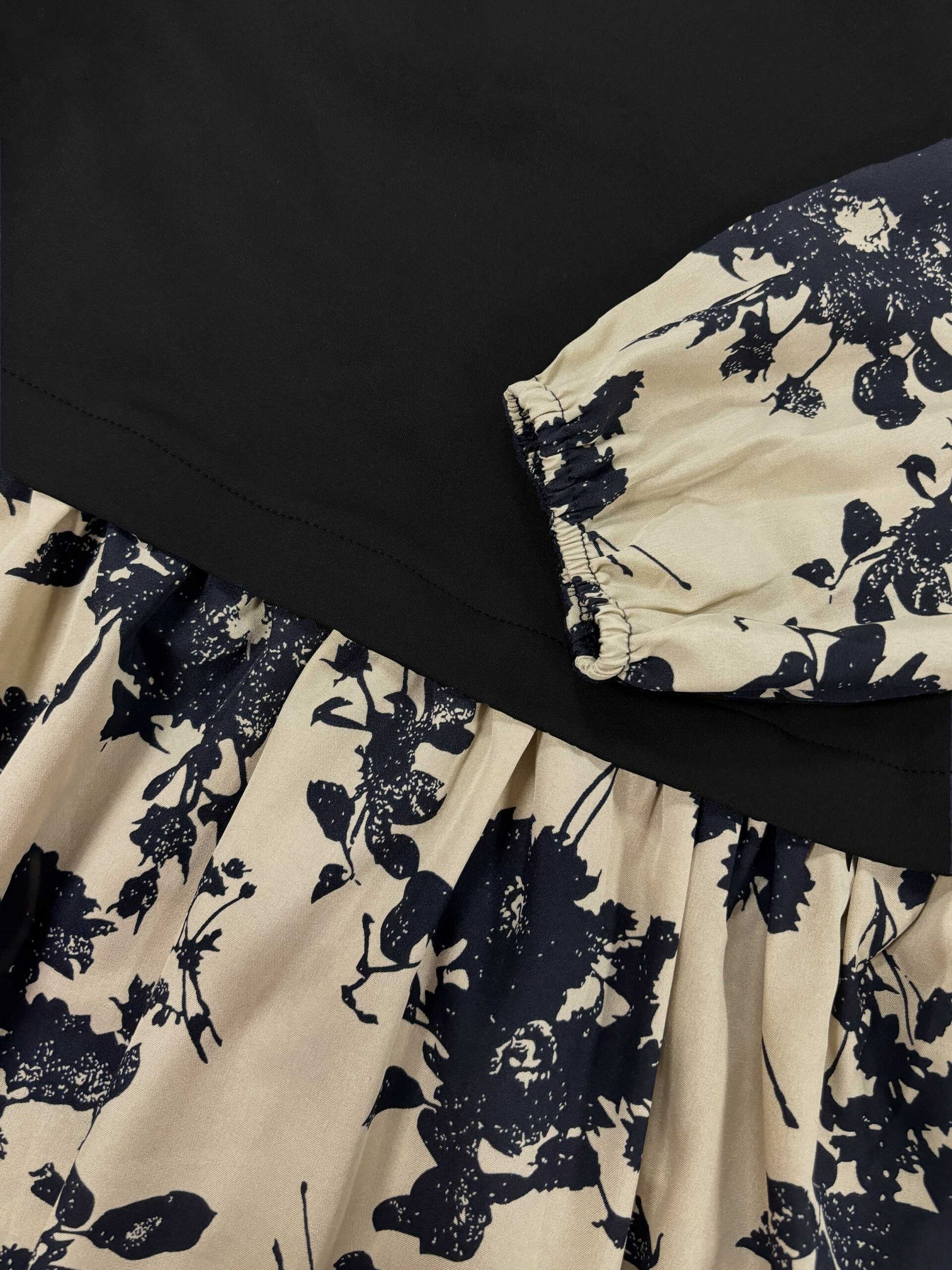 Beige base with an allover black floral silhouette print—scattered blossoms and leafy sprigs. The bodice is solid black, while the sleeves and peplum feature the bold floral pattern.