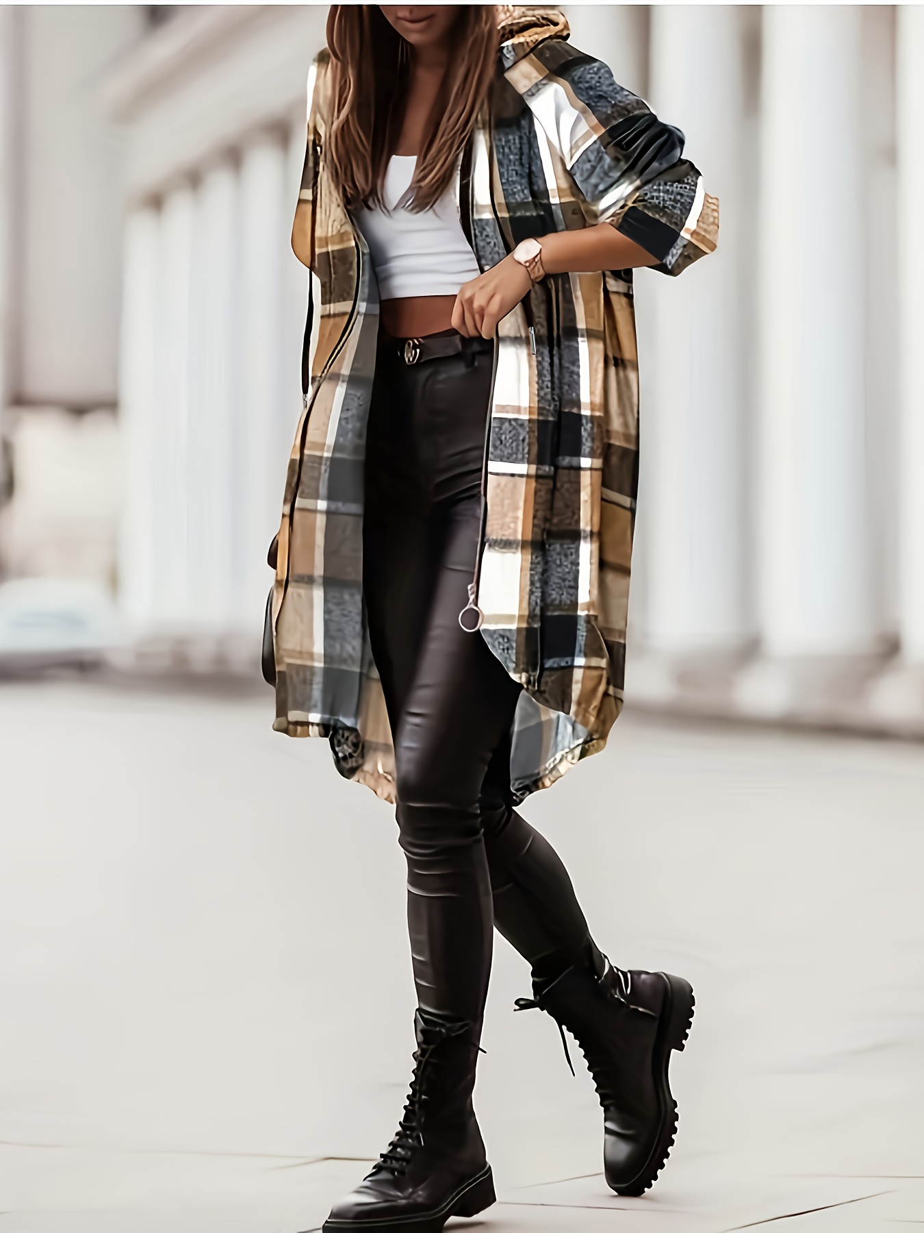 Womens Plaid Hooded Zip Front Jacket Casual Long Sleeve Fall Winter